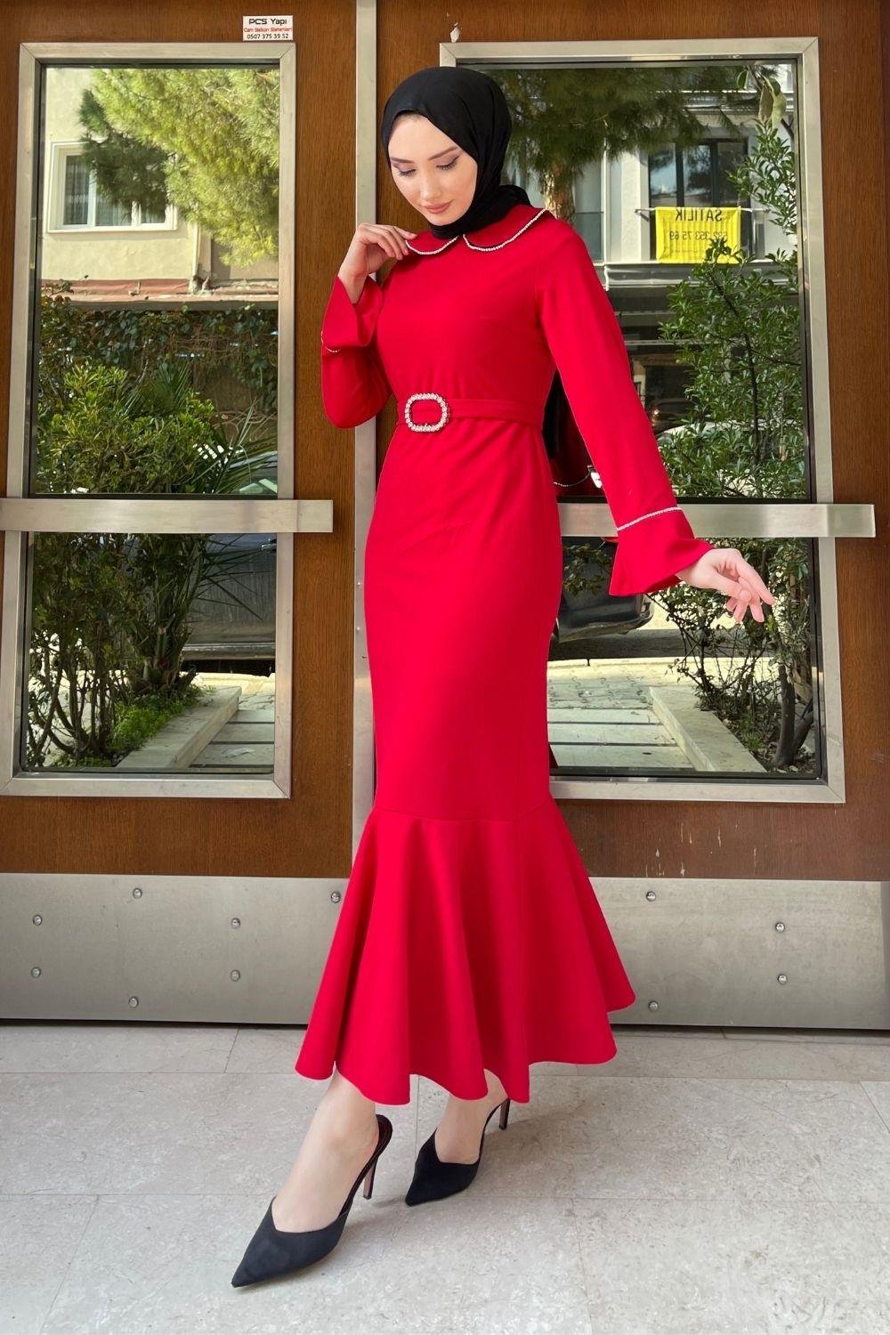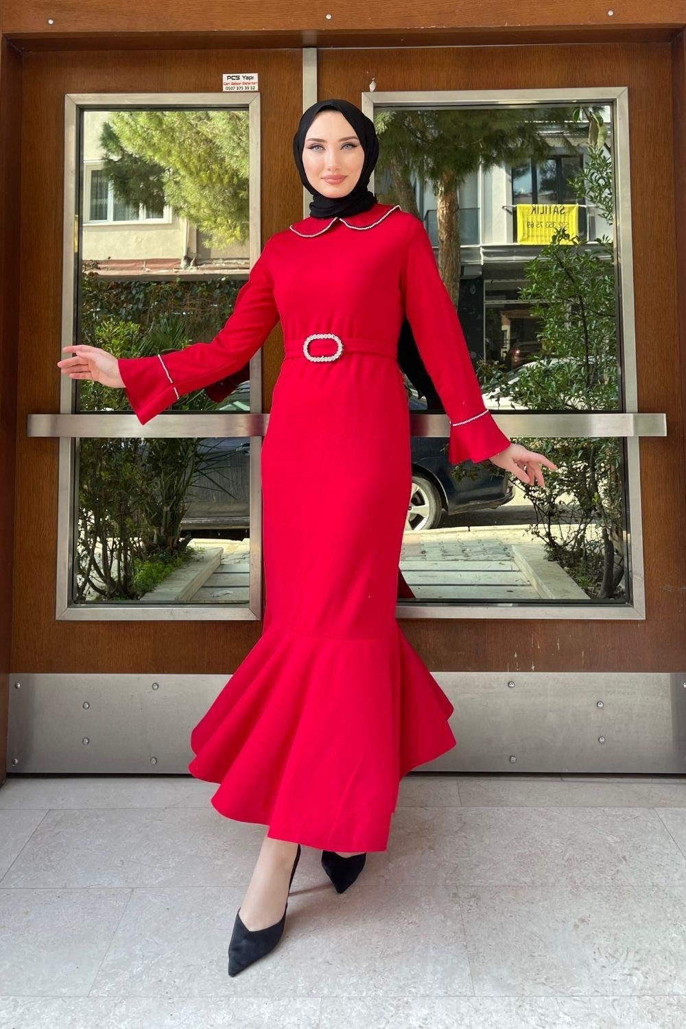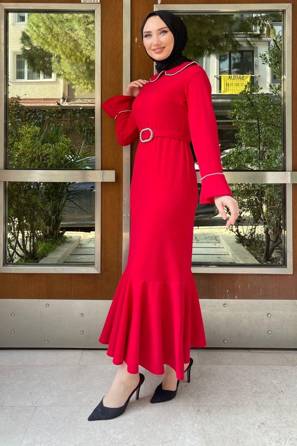 فستان كريب بياقة أطفال باللون الأحمر (9464)