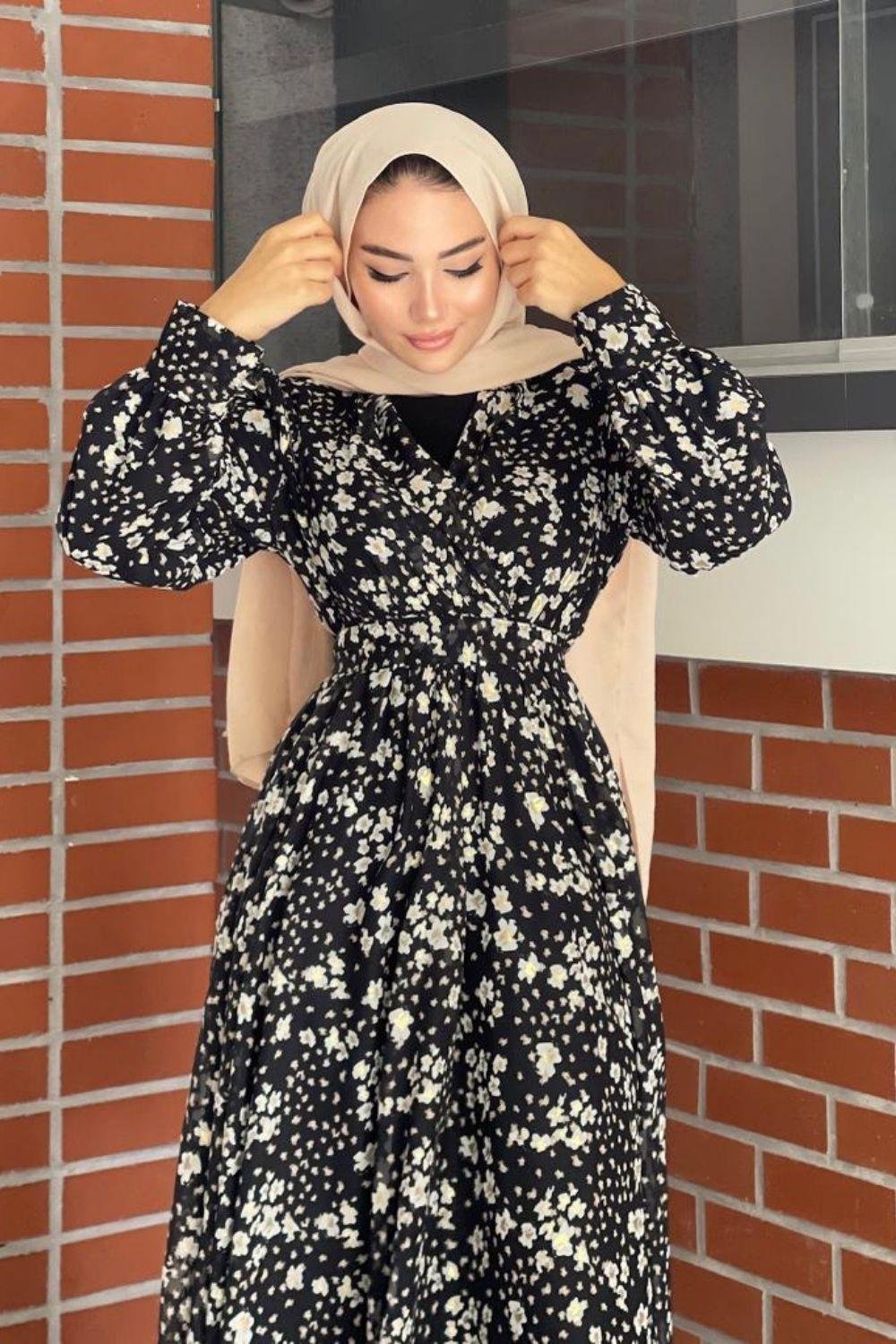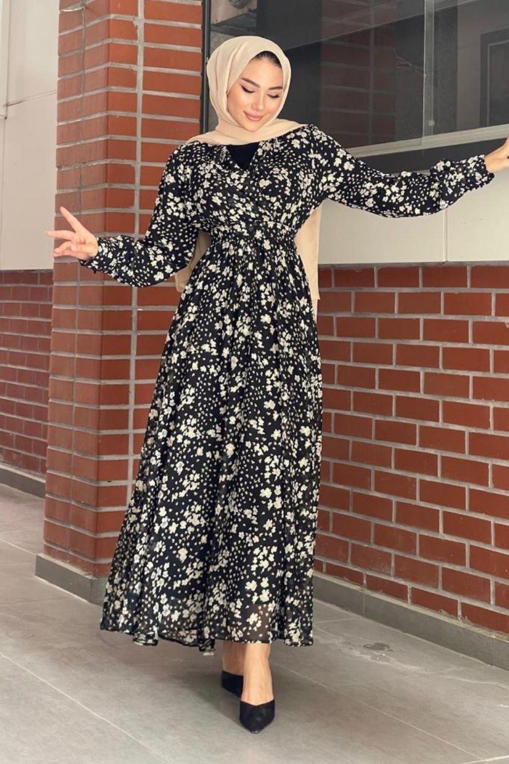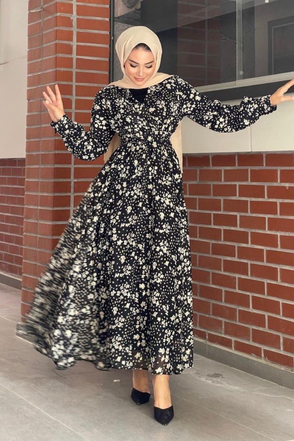 فستان شيفون منقوش بالزهور باللون البيج (5589)