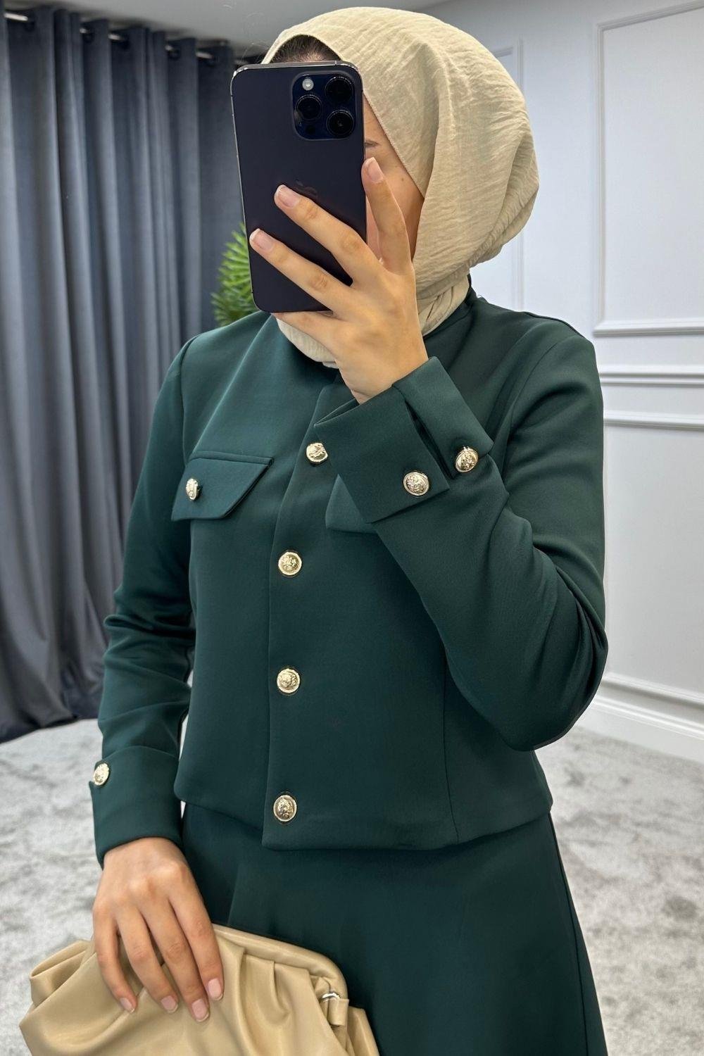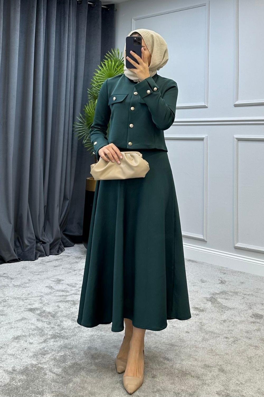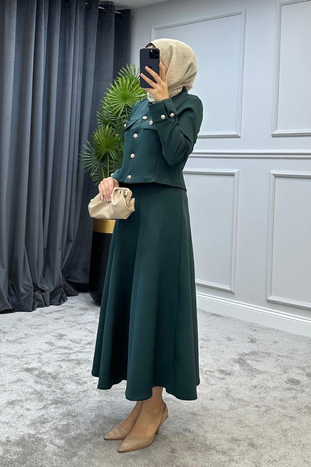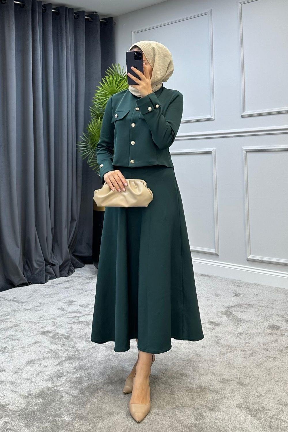 الغوص هو النسيج تحتوي السترة العلوية على أزرار كاملة الطول في الأمام الطول العلوي 47 سم طول التنورة 93 سم خصر التنورة مرن 1 مقاس (36-38) مقاس 2 (40-42) ارتفاع الموديل 168 سم 53 كجم