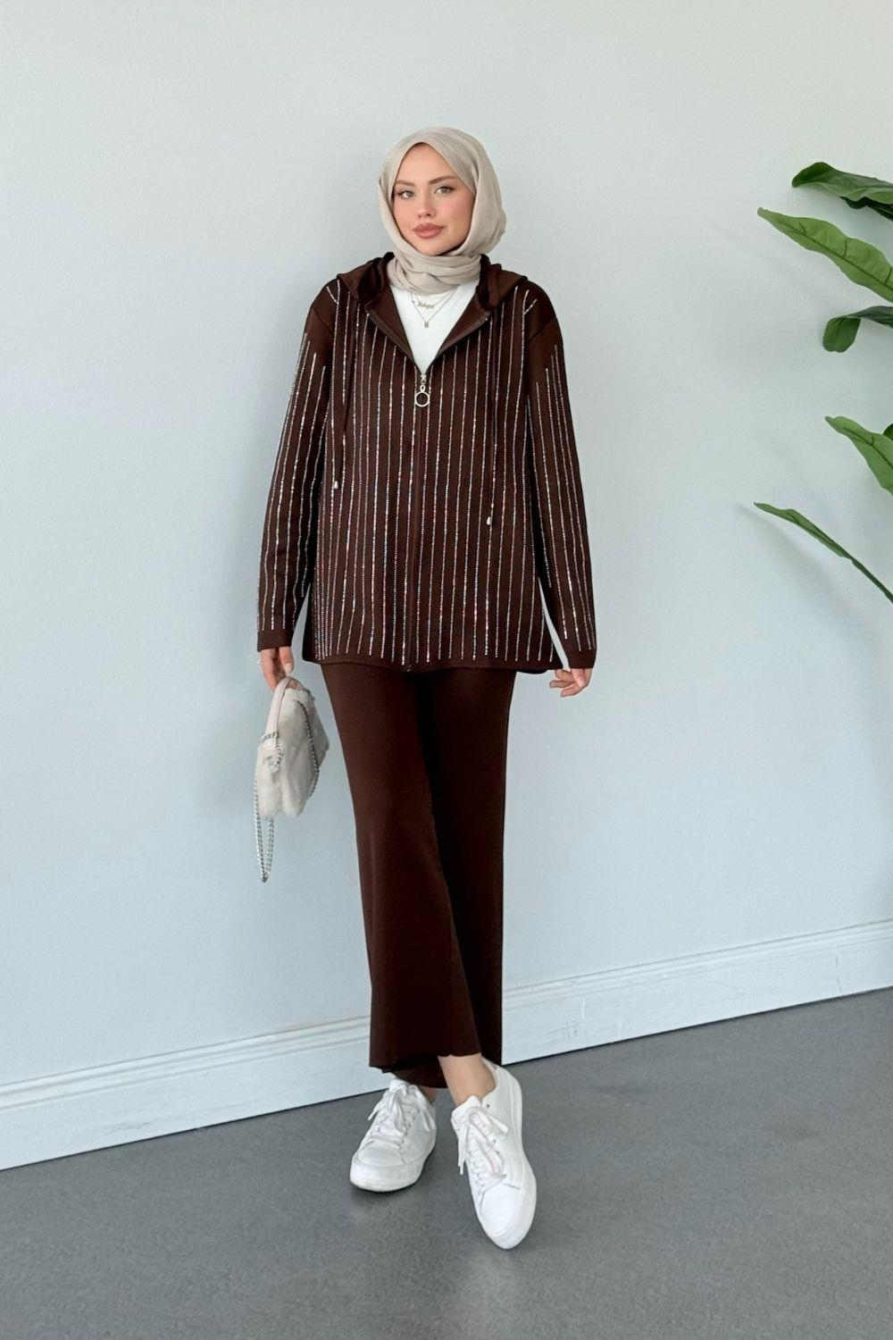 Eros Kapüşonlu Taşlı Takım Kahverengi (25340)