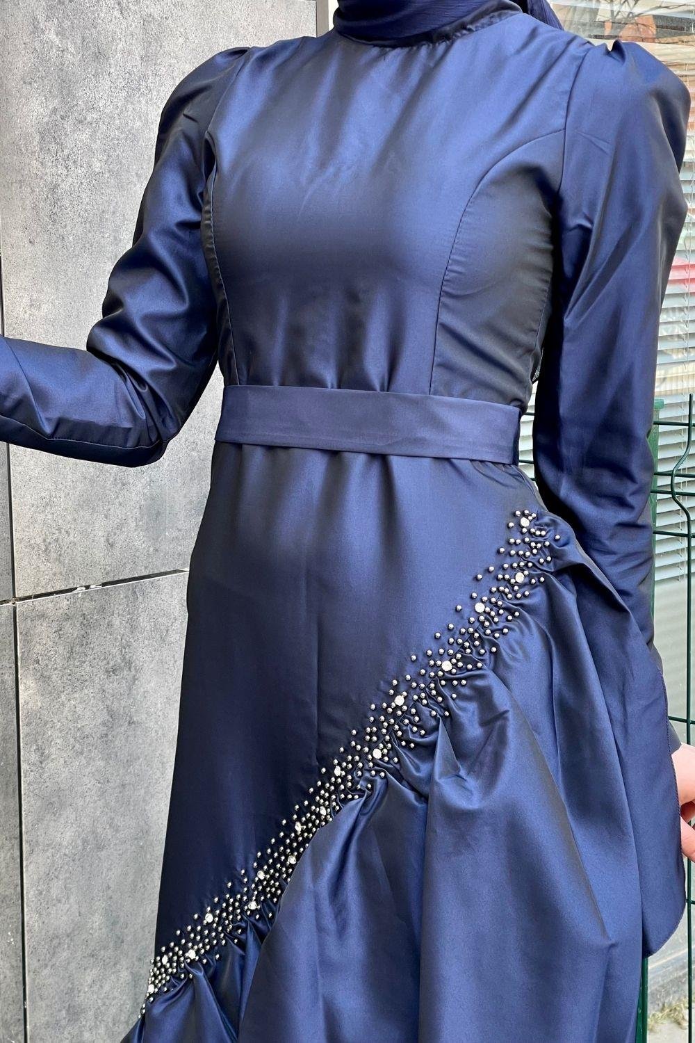 فستان سهرة مع تنورة مطرزة بحجر اللؤلؤ باللون الأزرق الداكن (4316)