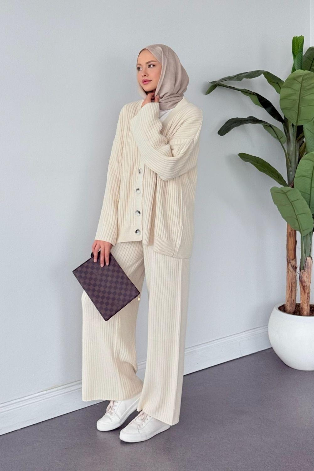 Takım, düğme detaylı üst formu ve Pantolon beli biyeli lastiklidir. İç göstermez tiftiklenme yapmaz.ile şık bir görünüm sunarken, lastikli beli sayesinde gün boyu konfor sağlar. Triko kumaşı ile hem rahat hem de modern bir tercihtir.
