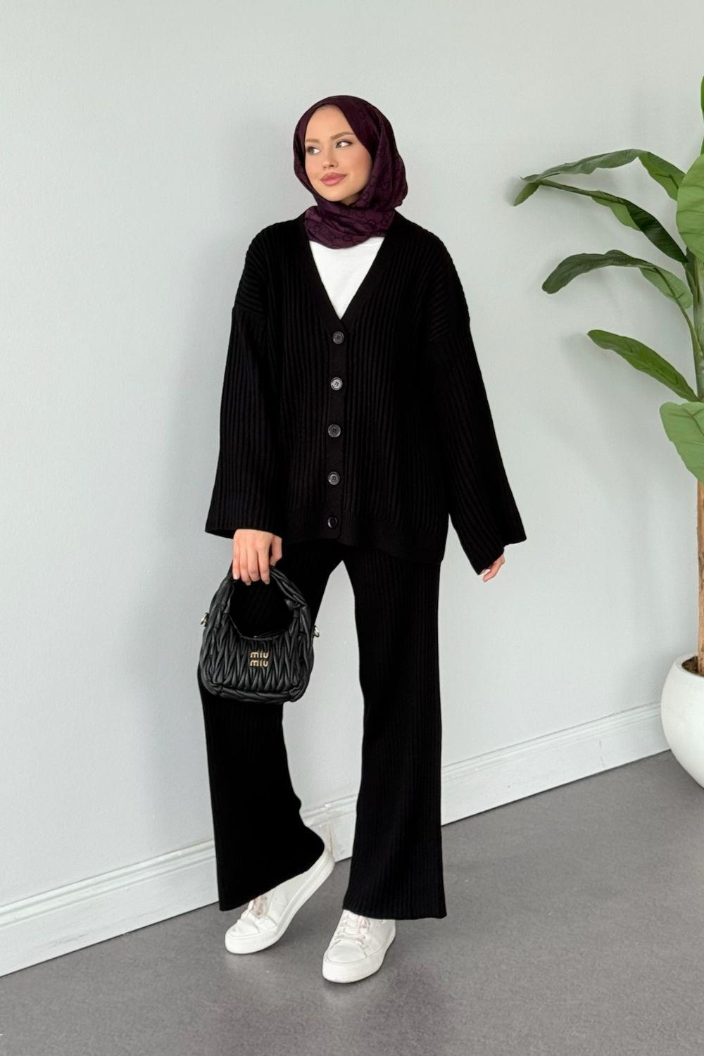 Takım, düğme detaylı üst formu ve Pantolon beli biyeli lastiklidir. İç göstermez tiftiklenme yapmaz.ile şık bir görünüm sunarken, lastikli beli sayesinde gün boyu konfor sağlar. Triko kumaşı ile hem rahat hem de modern bir tercihtir.