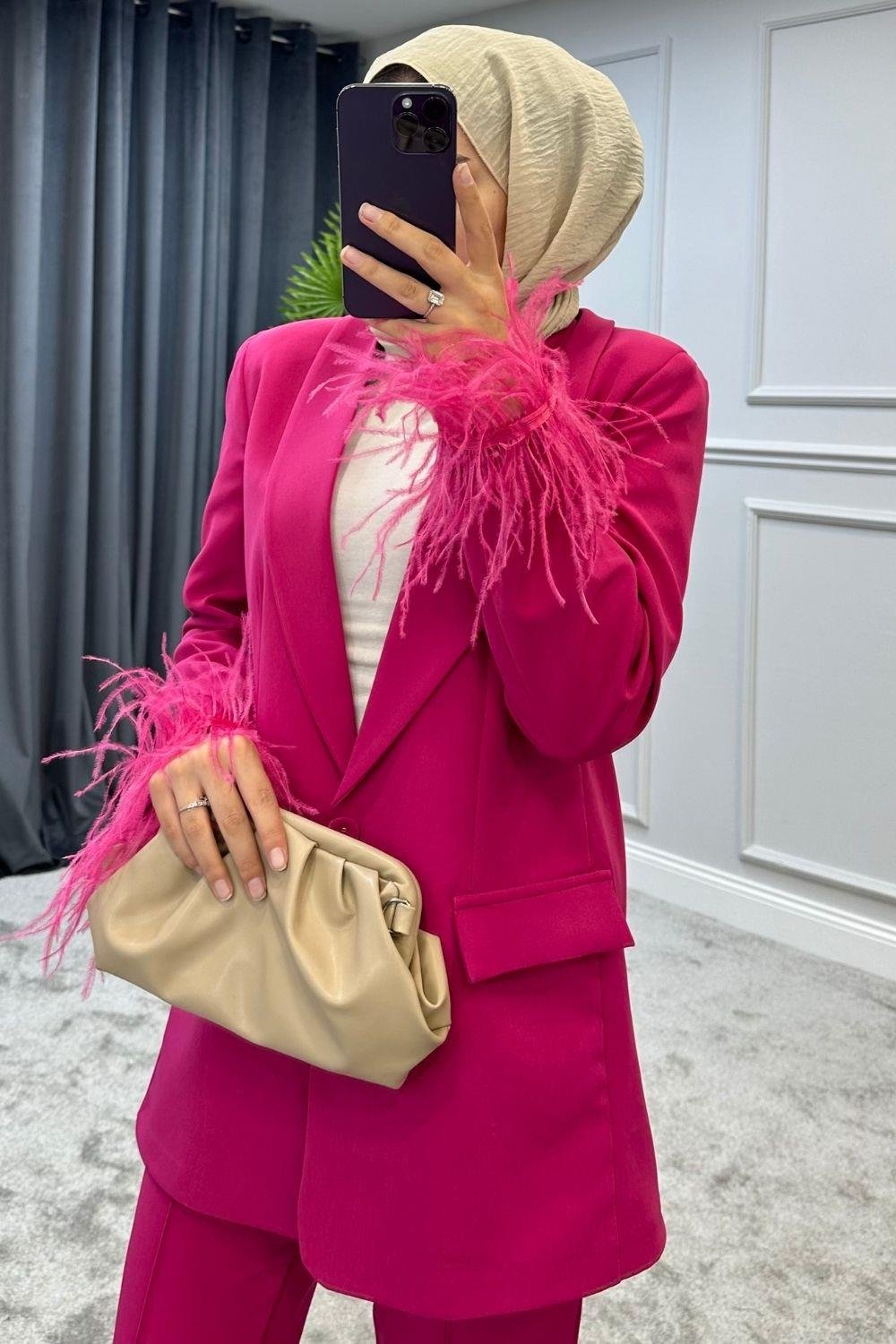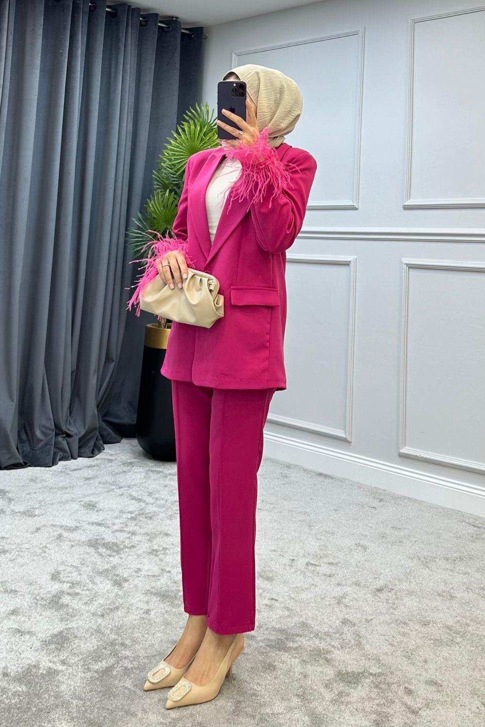 بدلة بأكمام ريشة باللون الوردي