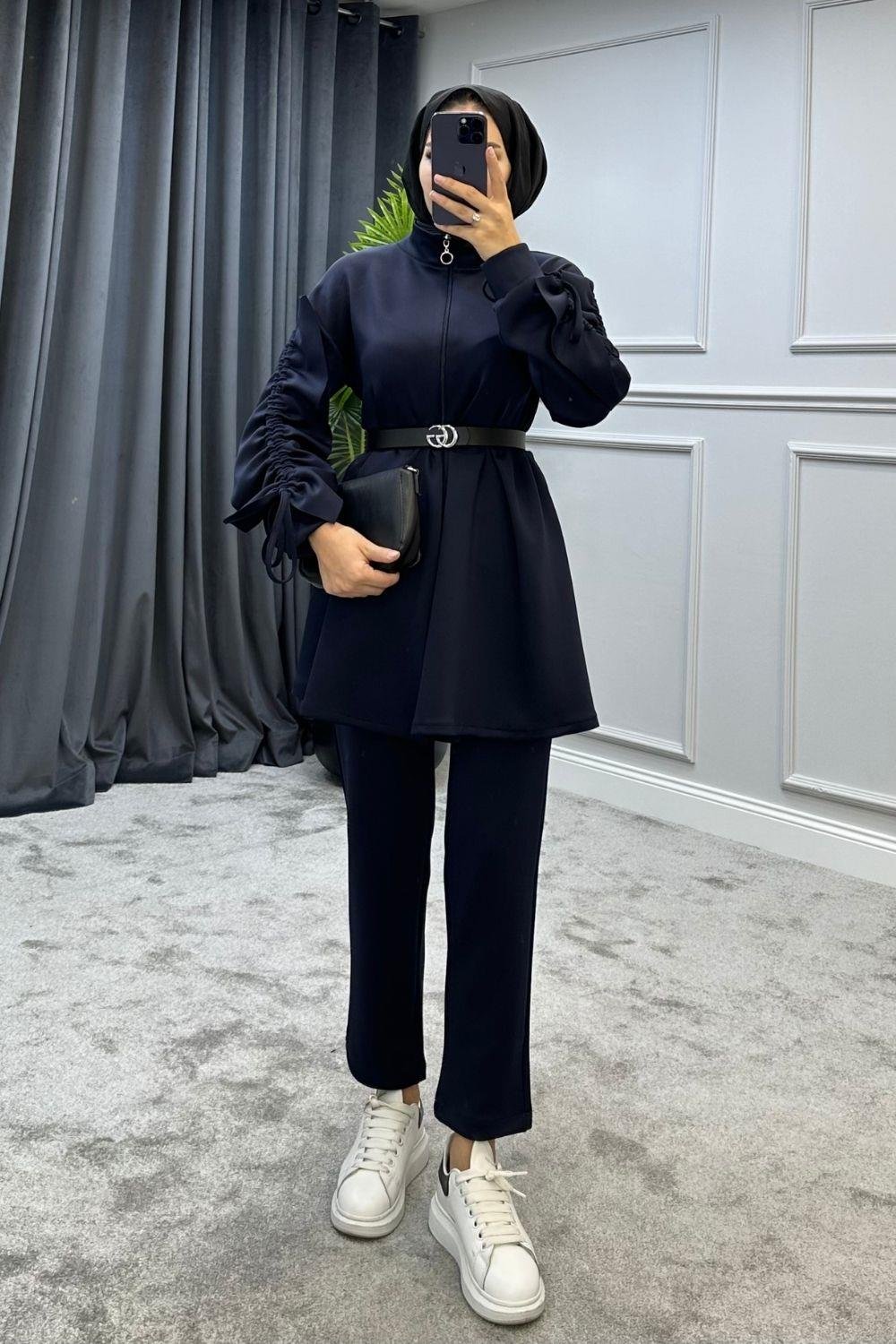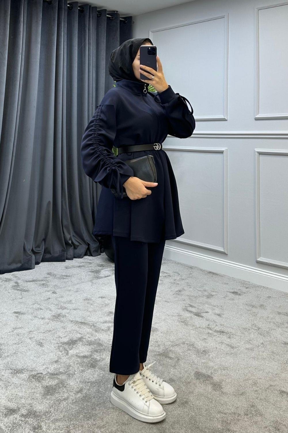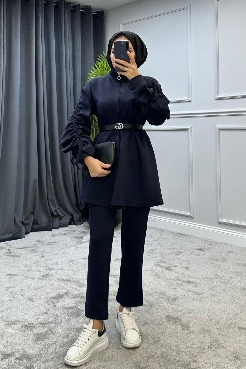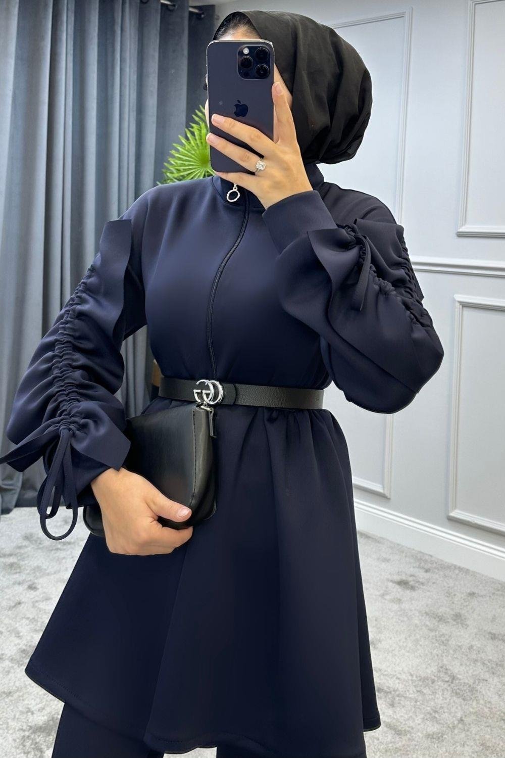 بدلة غوص بأكمام مجمعة باللون الأزرق الداكن (2064)