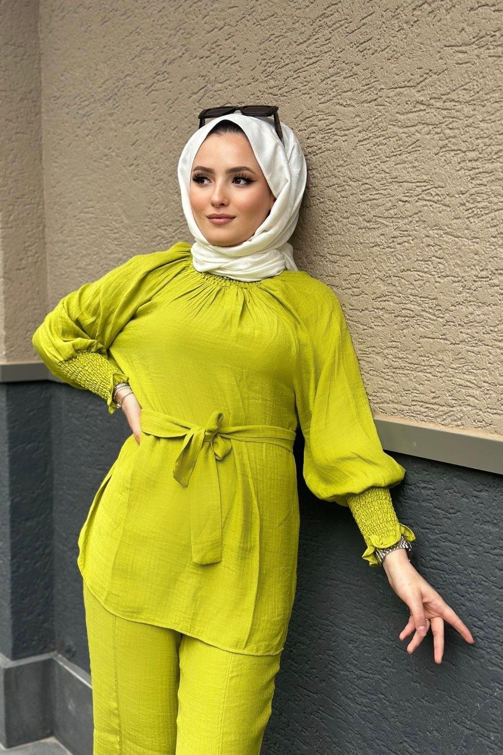 بدلة كتان بأكمام معقوفة، لون أخضر زيتي (2034)