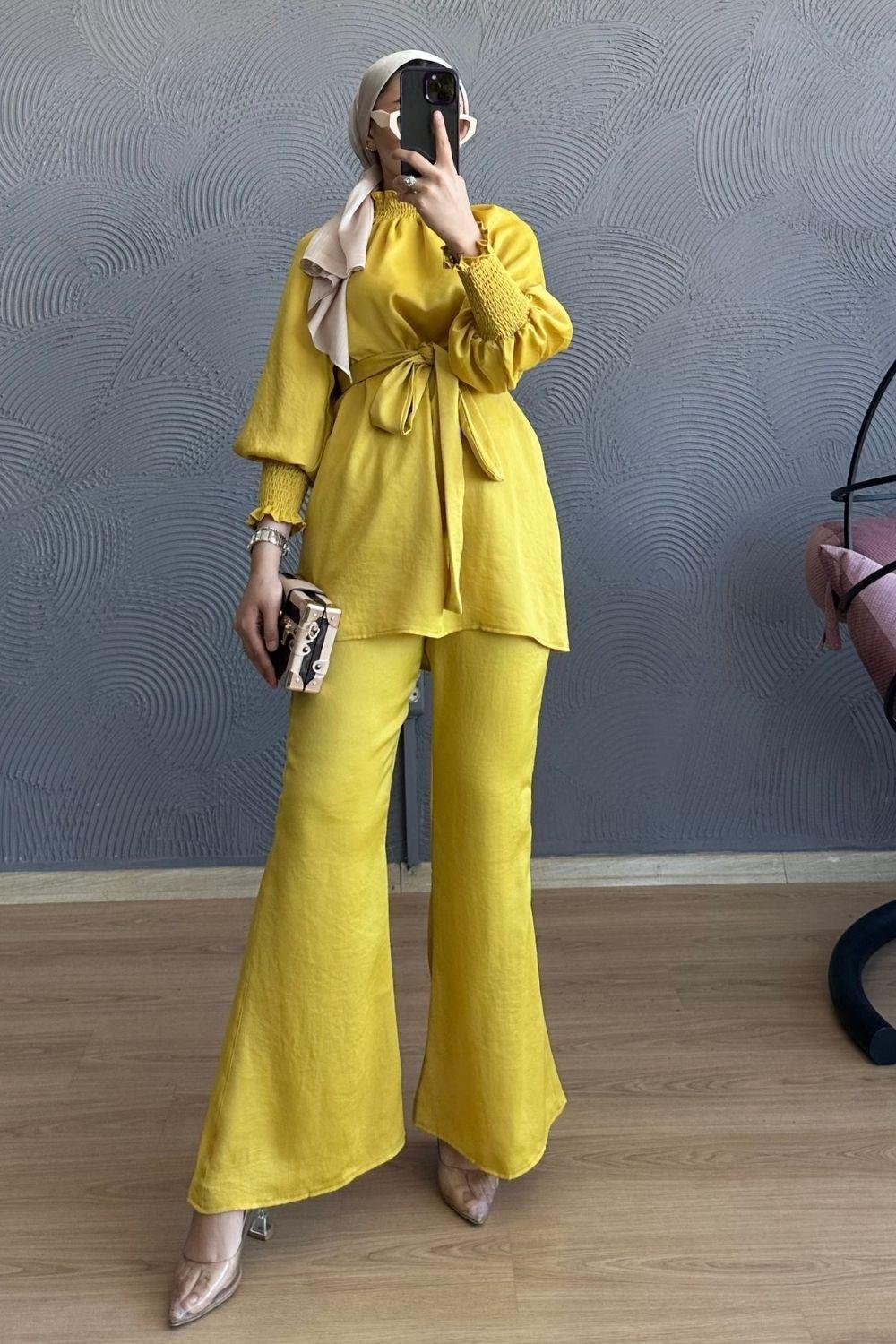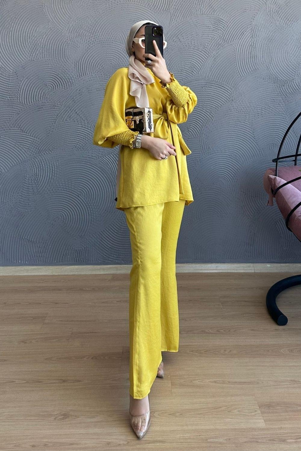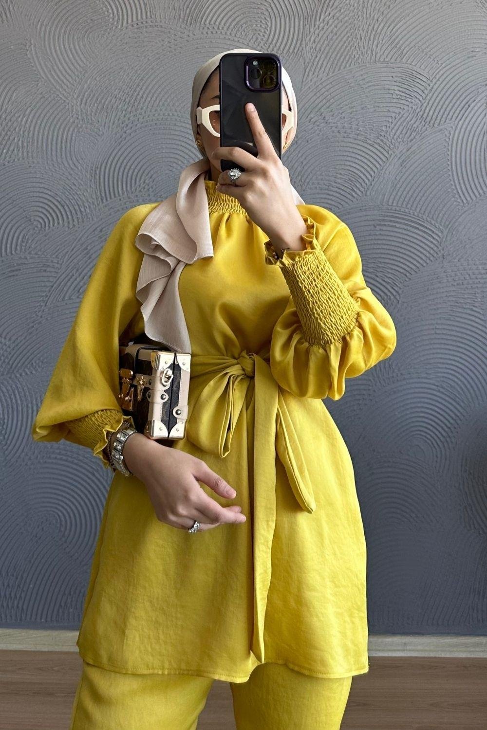 نسيج المنتج هو الساتان يوجد بها حزام متنقل طول التونيك 80 سم، وطول البنطلون 100 سم حجم المنتج 1-2 تتميز السراويل بخصر مطاطي رقبة التونيك مرنة