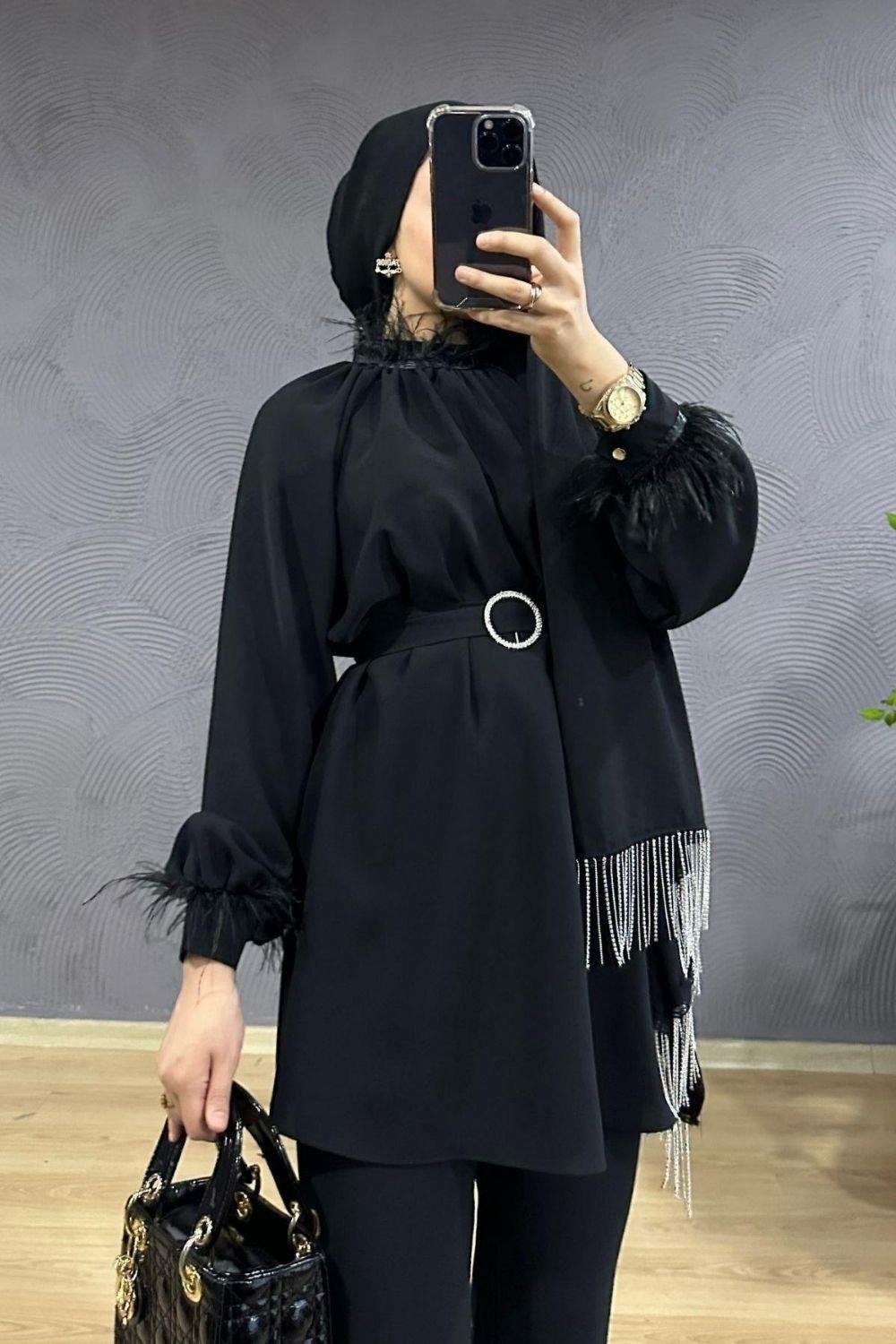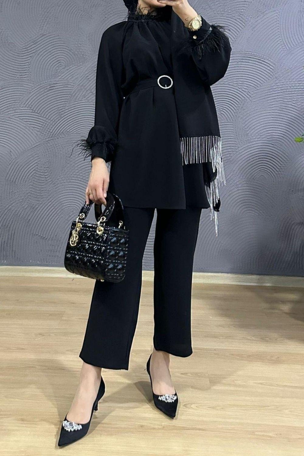 القماش كريب مستورد بها حزام متحرك حجري تتميز السراويل بخصر مطاطي الياقة والأكمام مع تفاصيل الريش لا يسقط الريش ولا يتدهور عند غسله. أعلى 85 سم بنطلون 95 سم الموديل 168 سم 53 كجم