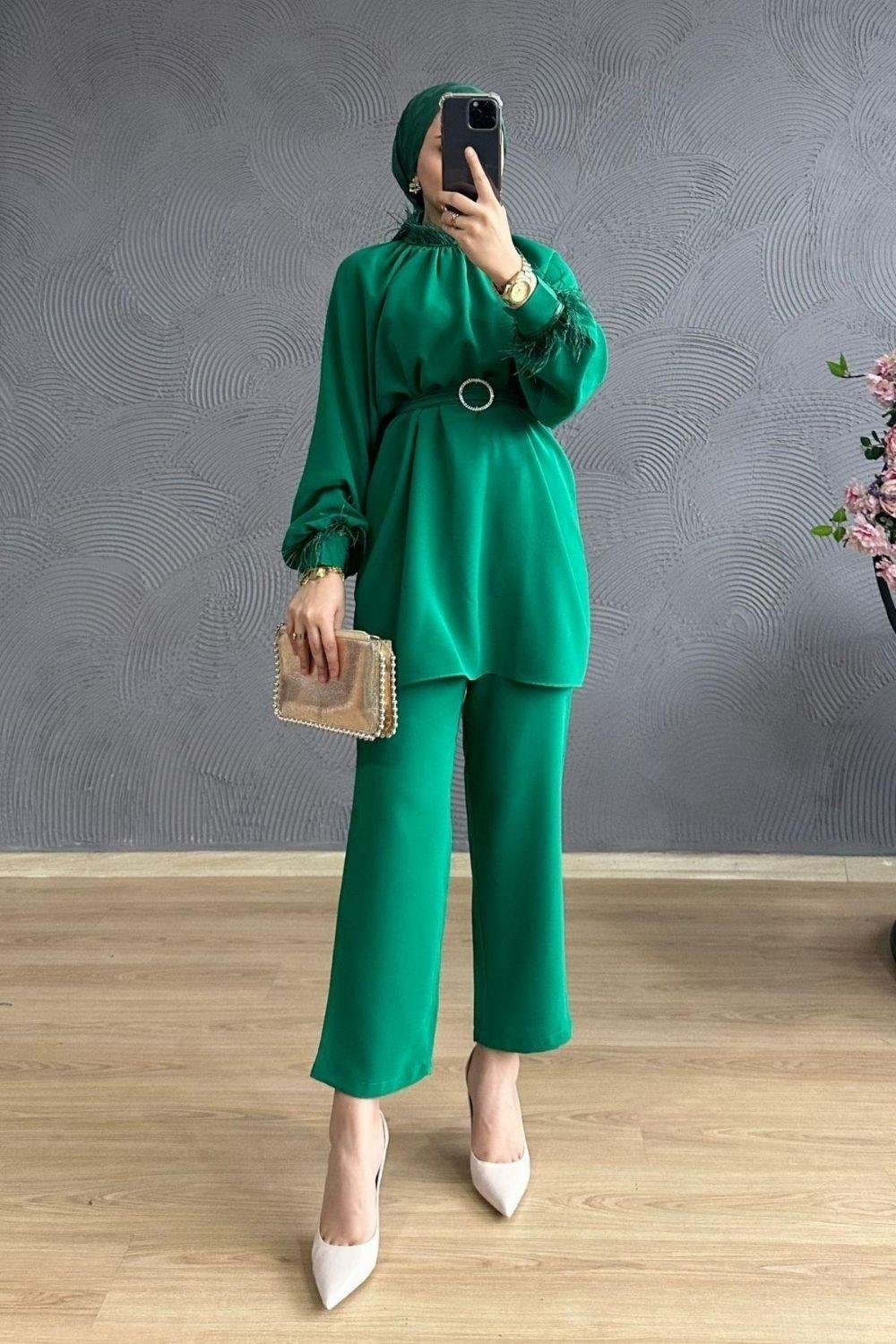 القماش كريب مستورد بها حزام متحرك حجري تتميز السراويل بخصر مطاطي الياقة والأكمام مع تفاصيل الريش لا يسقط الريش ولا يتدهور عند غسله. أعلى 85 سم بنطلون 95 سم الموديل 168 سم 53 كجم