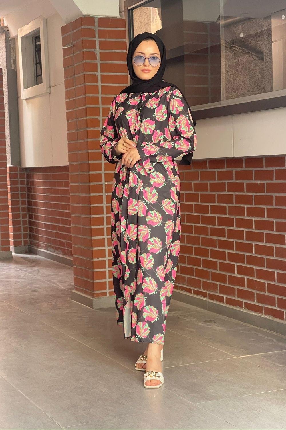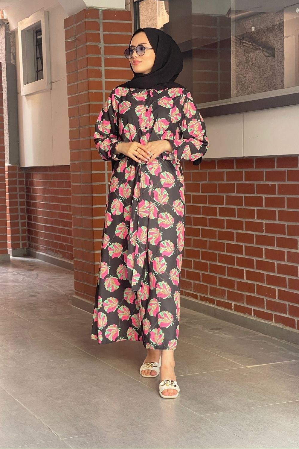 فستان منقوش بربطة أمامية باللون الأسود (10400)