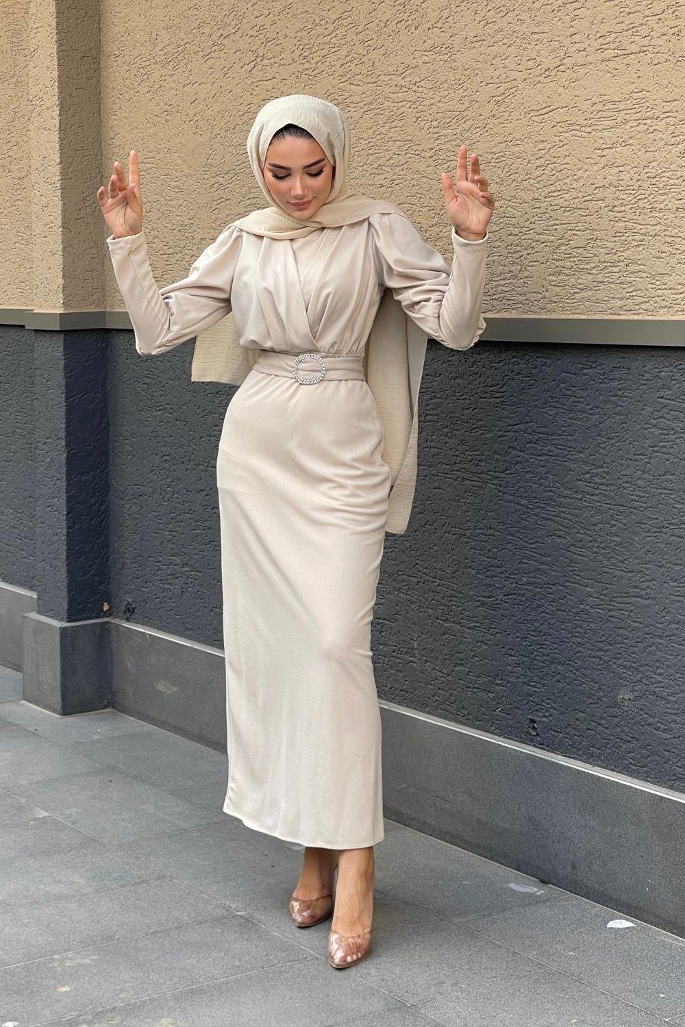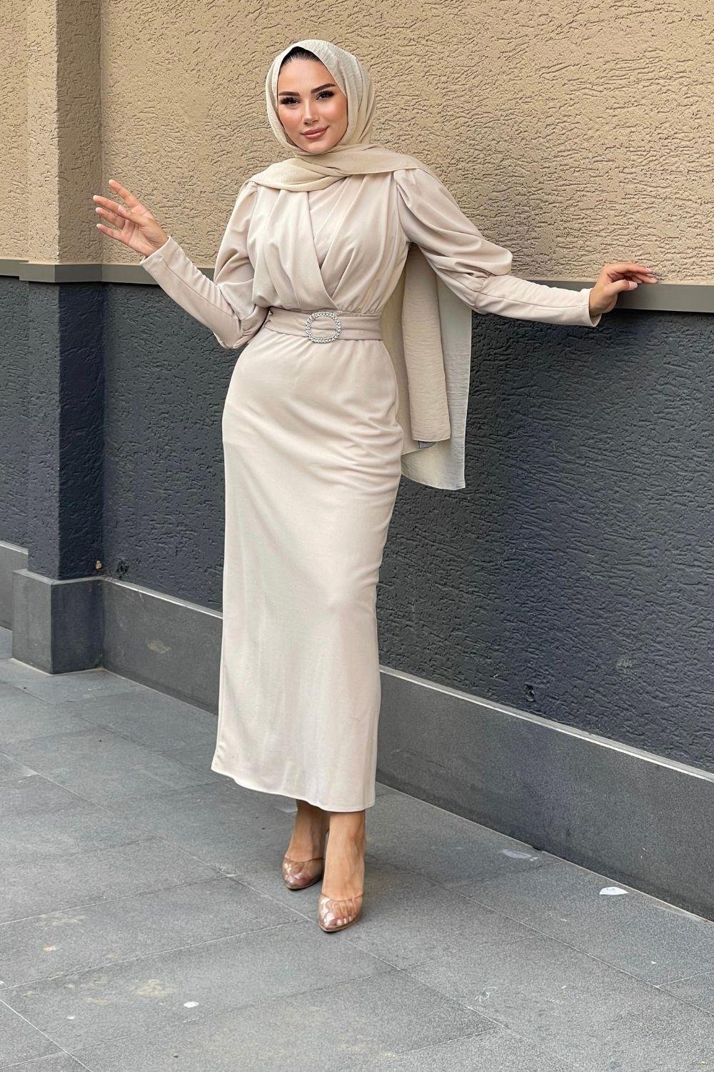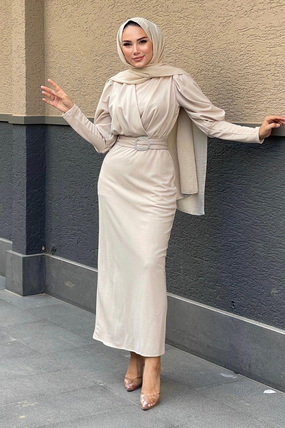 فستان بحزام متقاطع من الأمام باللون البيج (4140)