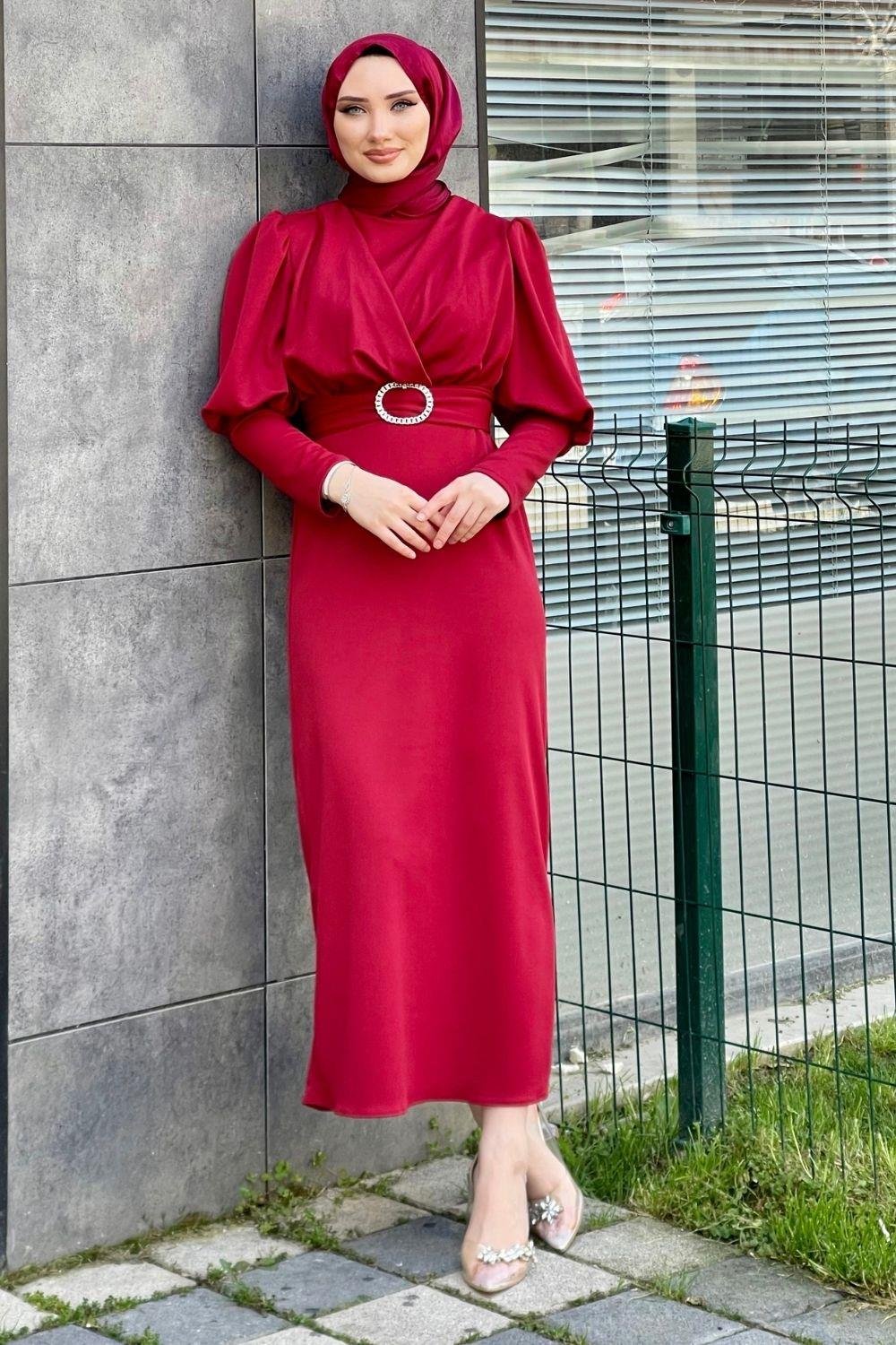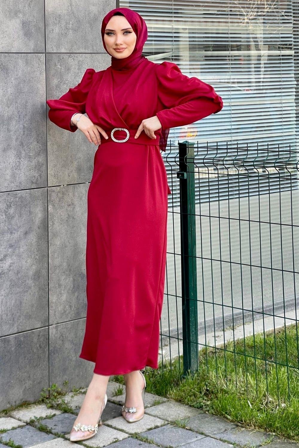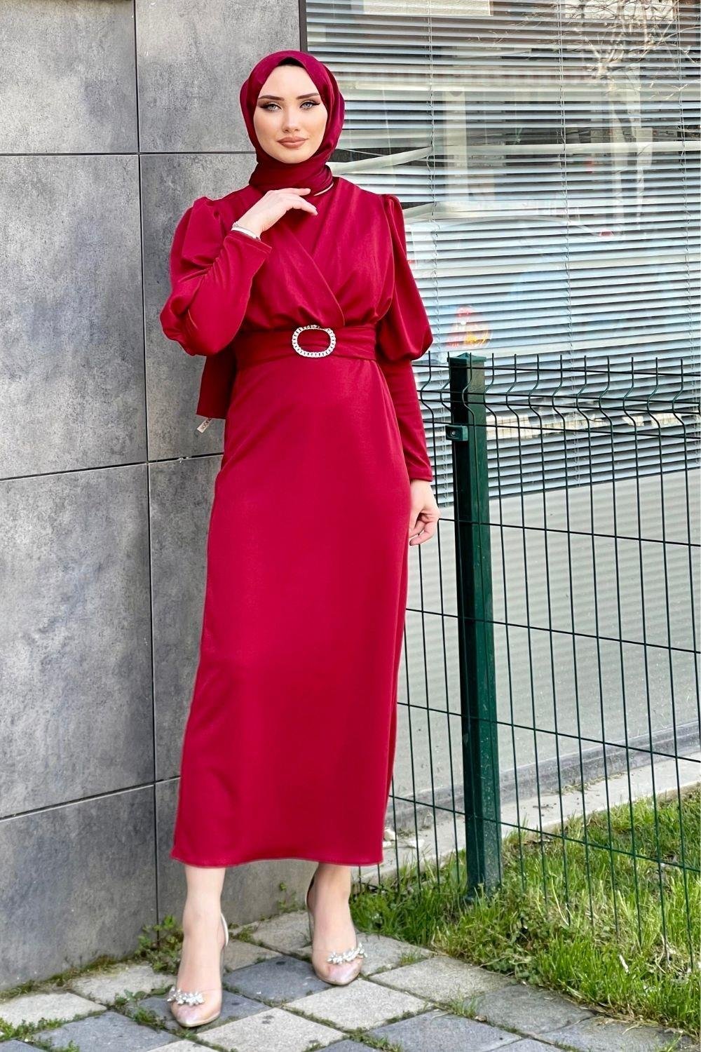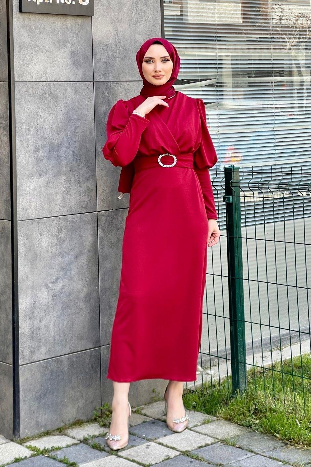 فستان بحزام متقاطع من الأمام باللون الأحمر الداكن (4140)