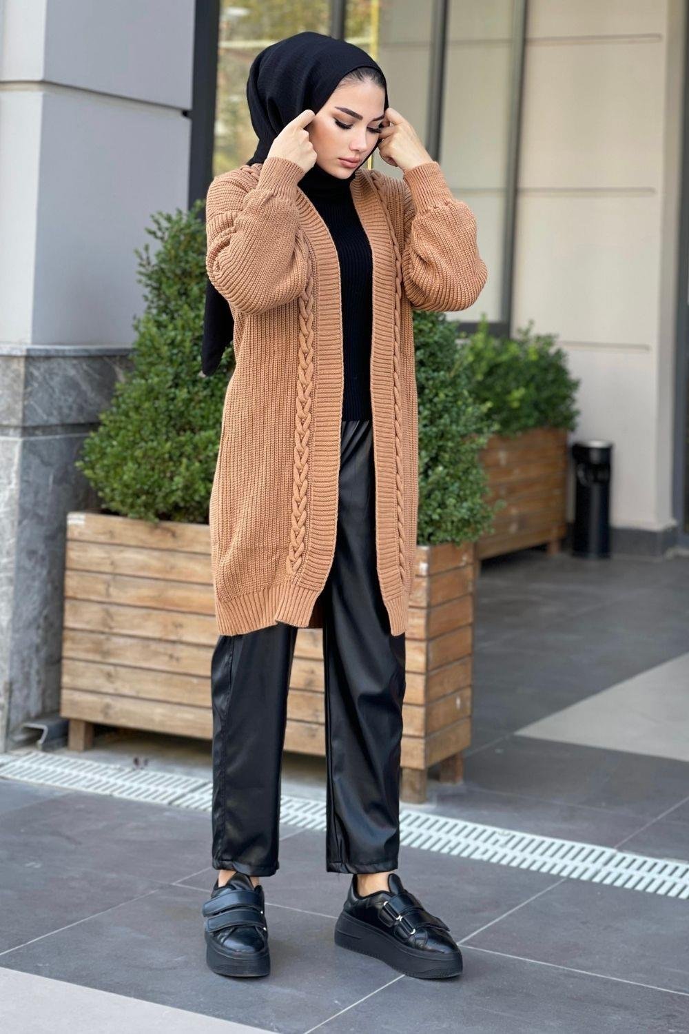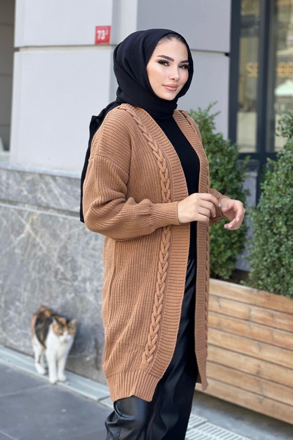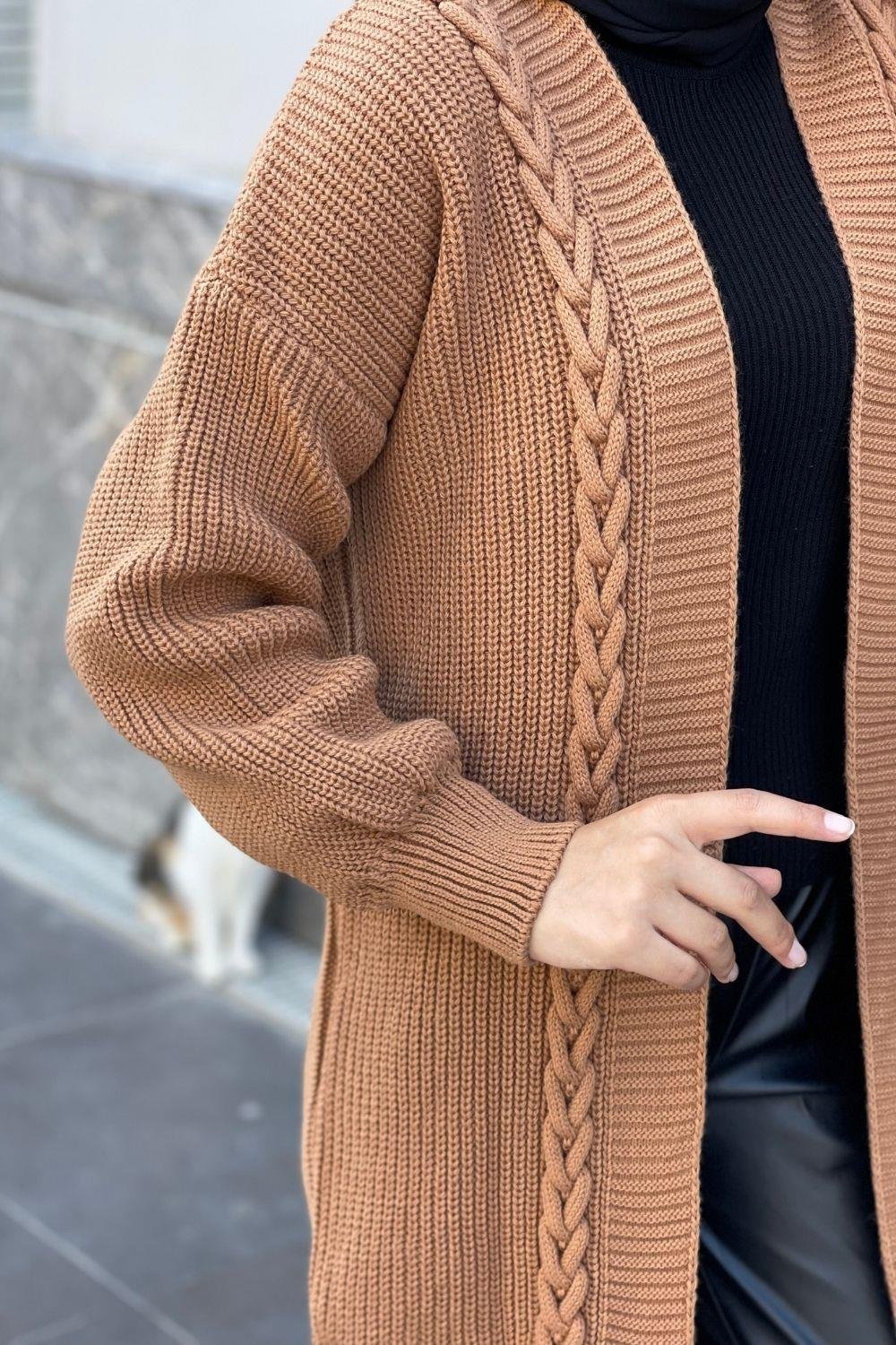 سترة طويلة مضفرة باللون البني (230400)