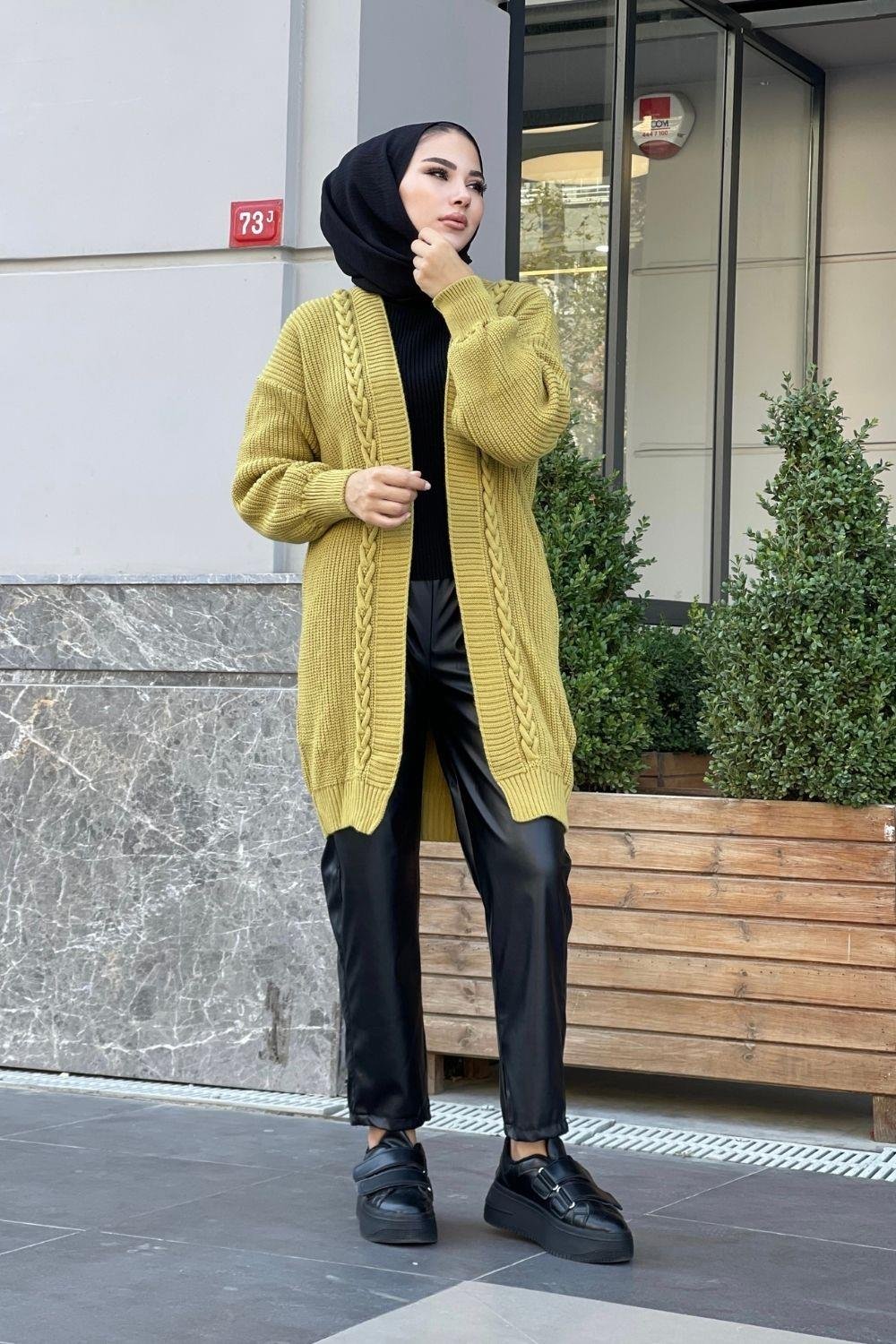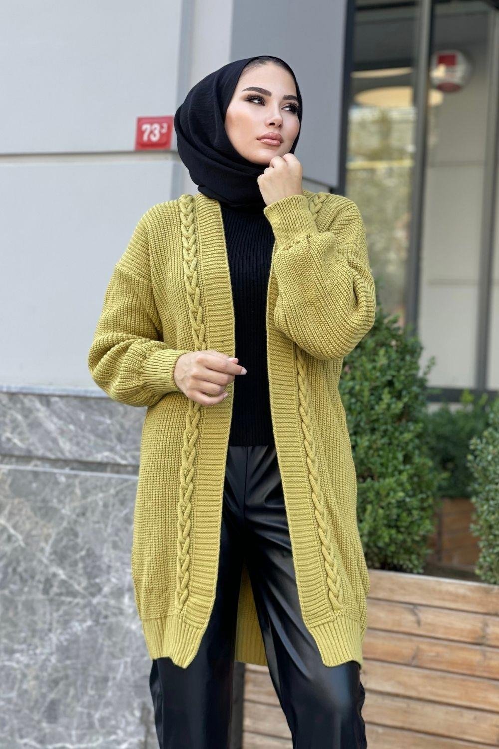 سترة صوفية طويلة مضفرة باللون الأخضر الزيتي (230400)
