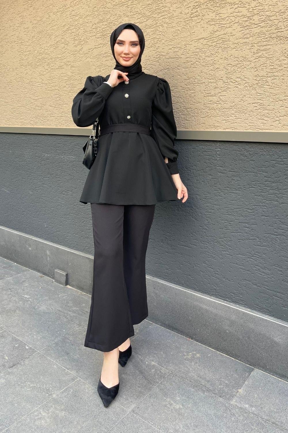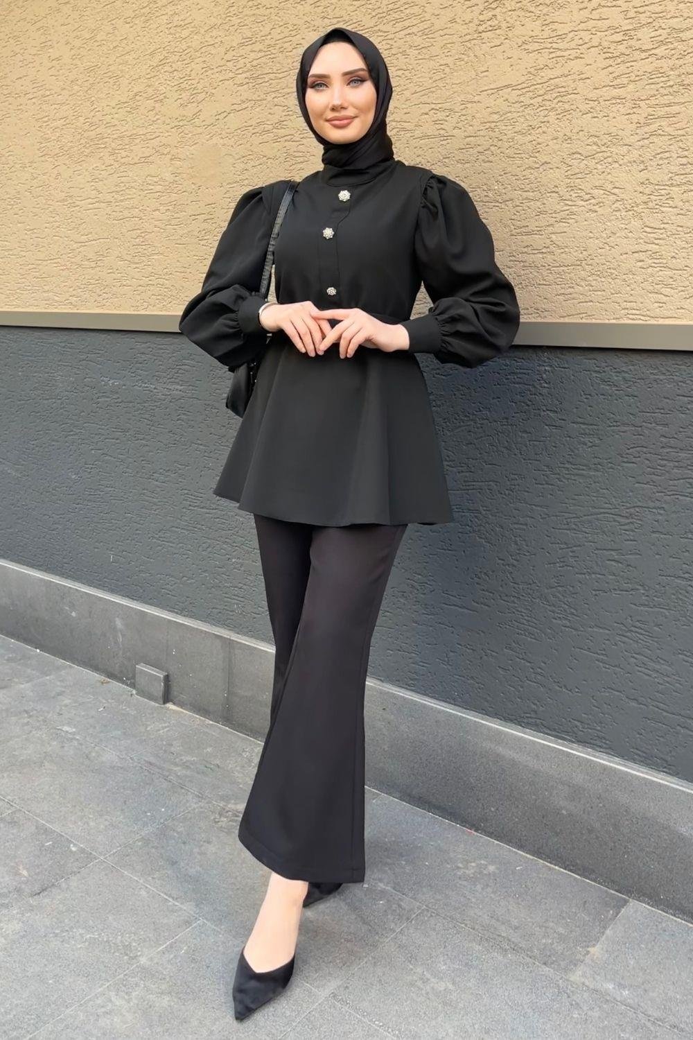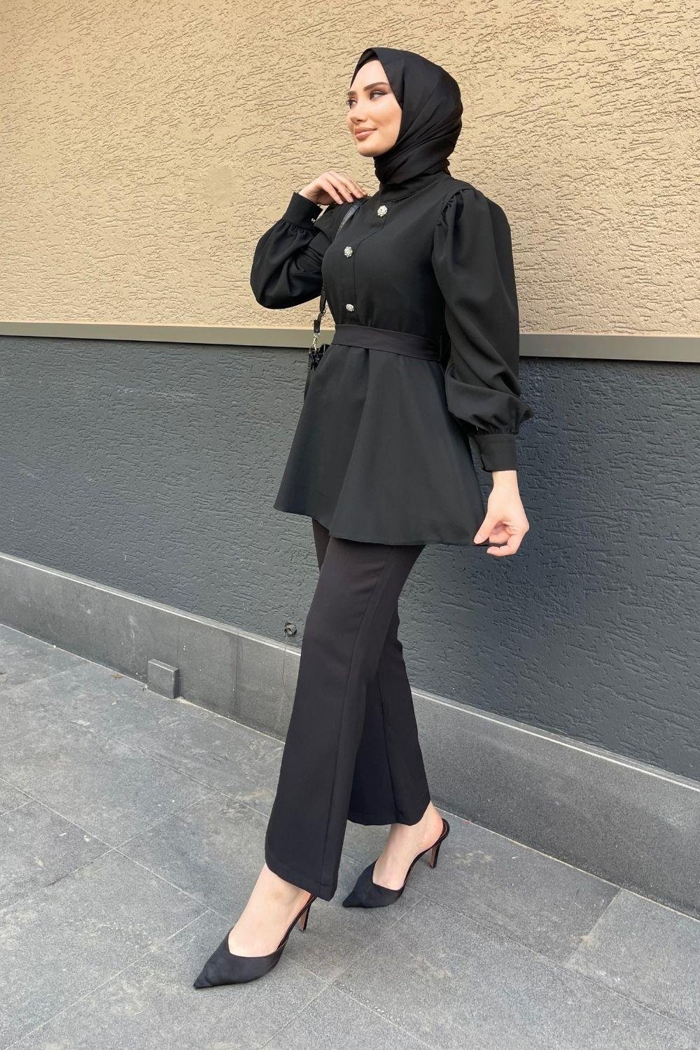 بدلة كريب بأزرار حجرية باللون الأسود (5891)