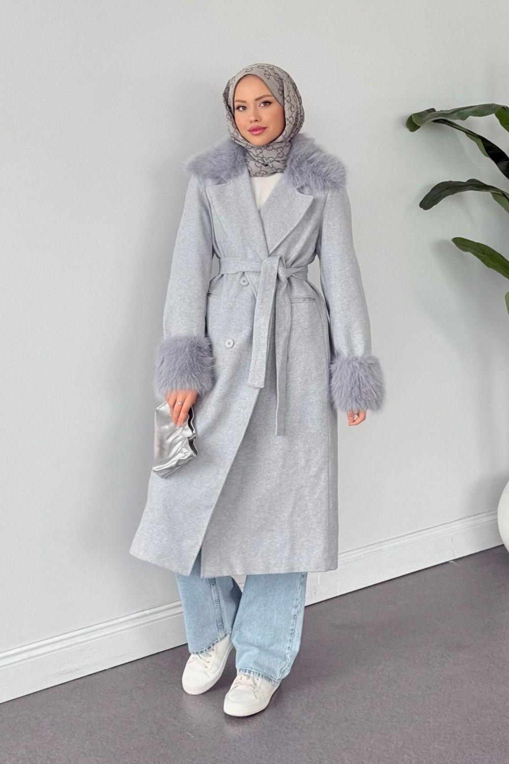 Yaren Yaka Kürk Kaşe Kaban Gri (51009)