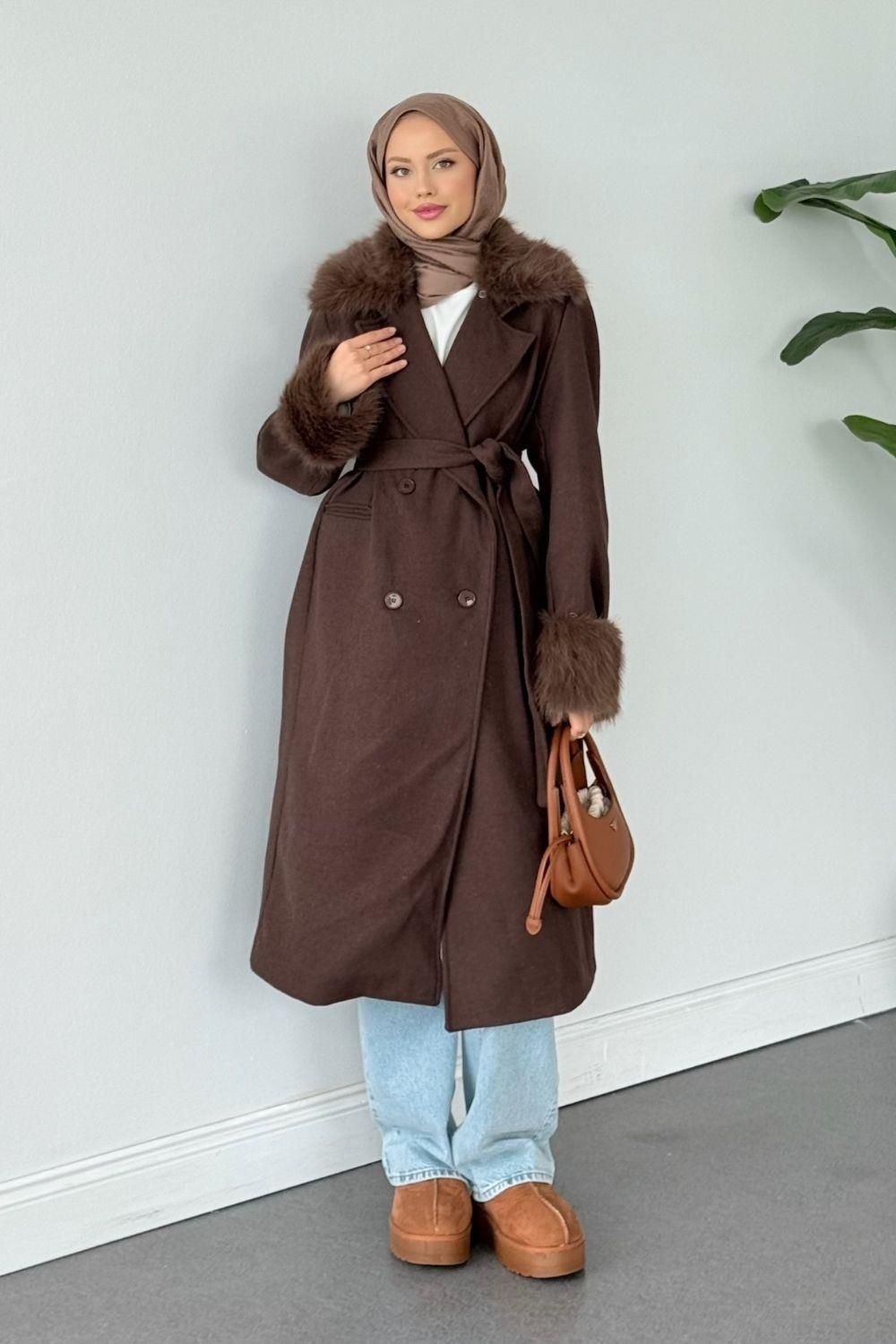 Yaka ve kol uçlarında kürk detayı şık ve sofistike görünüm kazandırır.