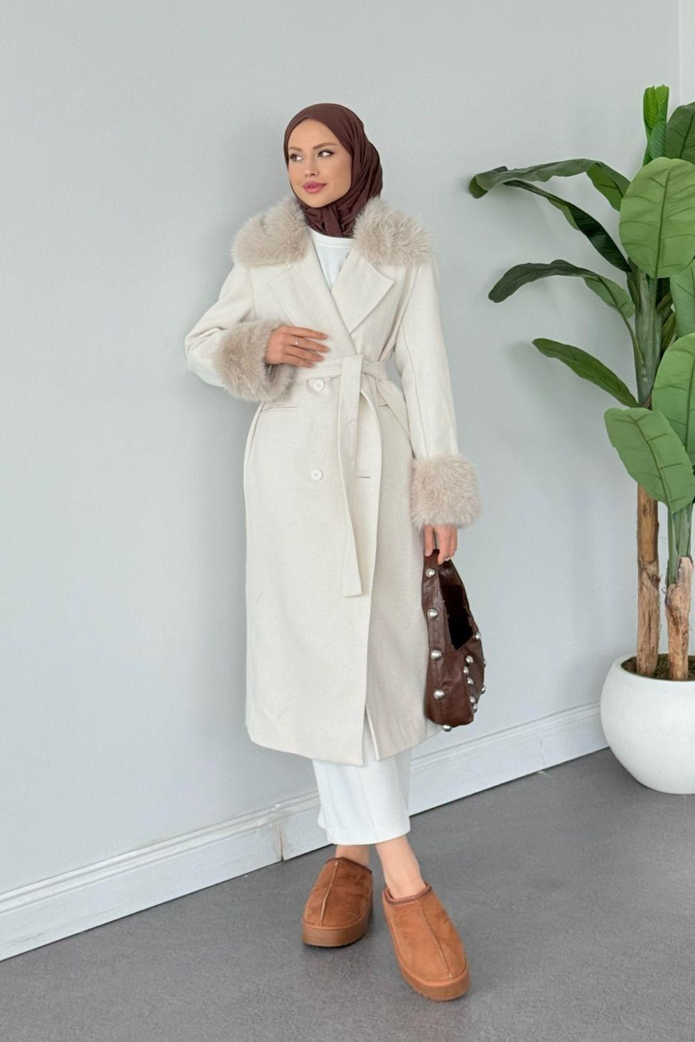 Yaren Yaka Kürk Kaşe Kaban Krem 51009