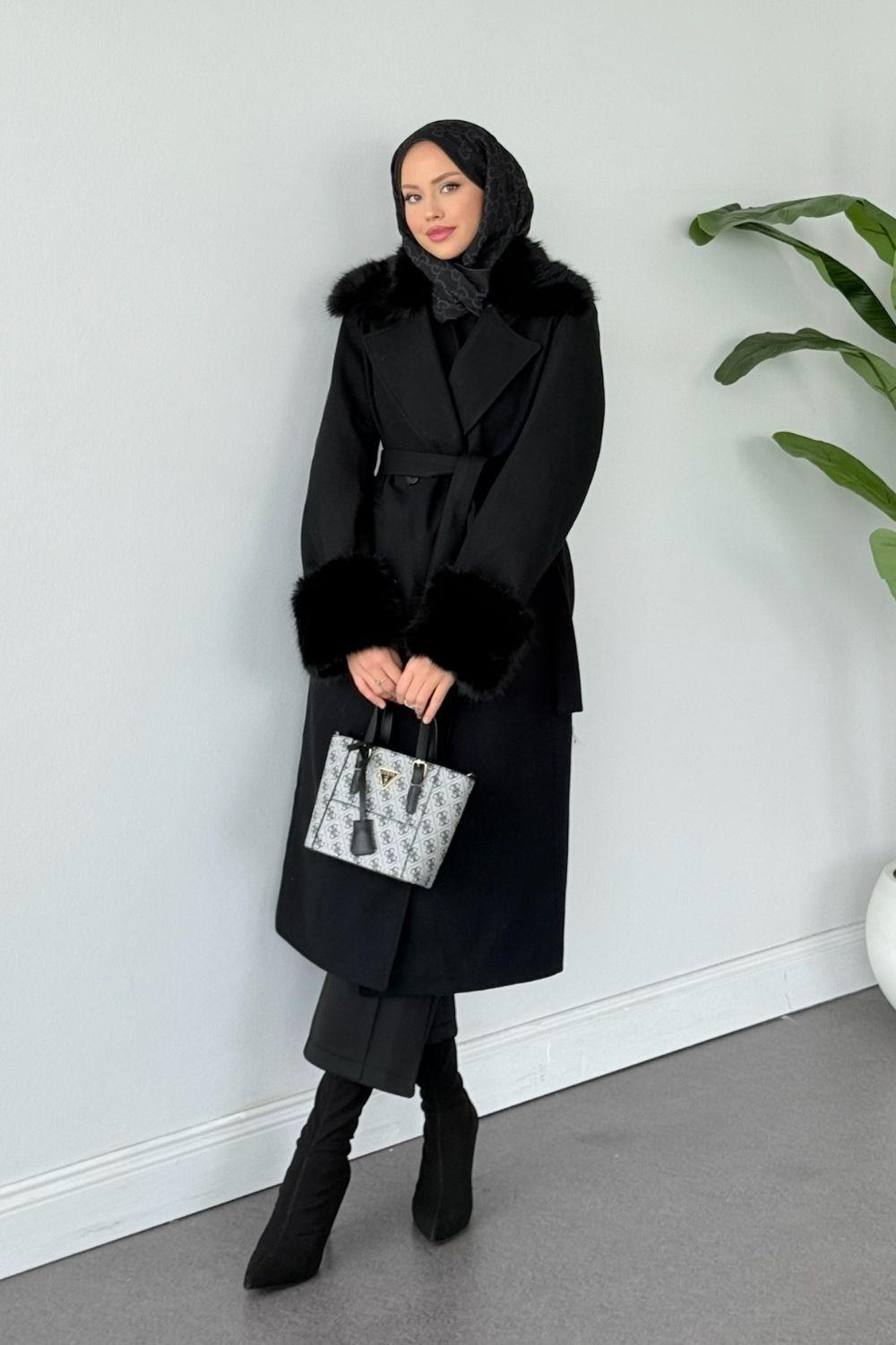 Yaren Yaka Kürk Kaşe Kaban Siyah 51009