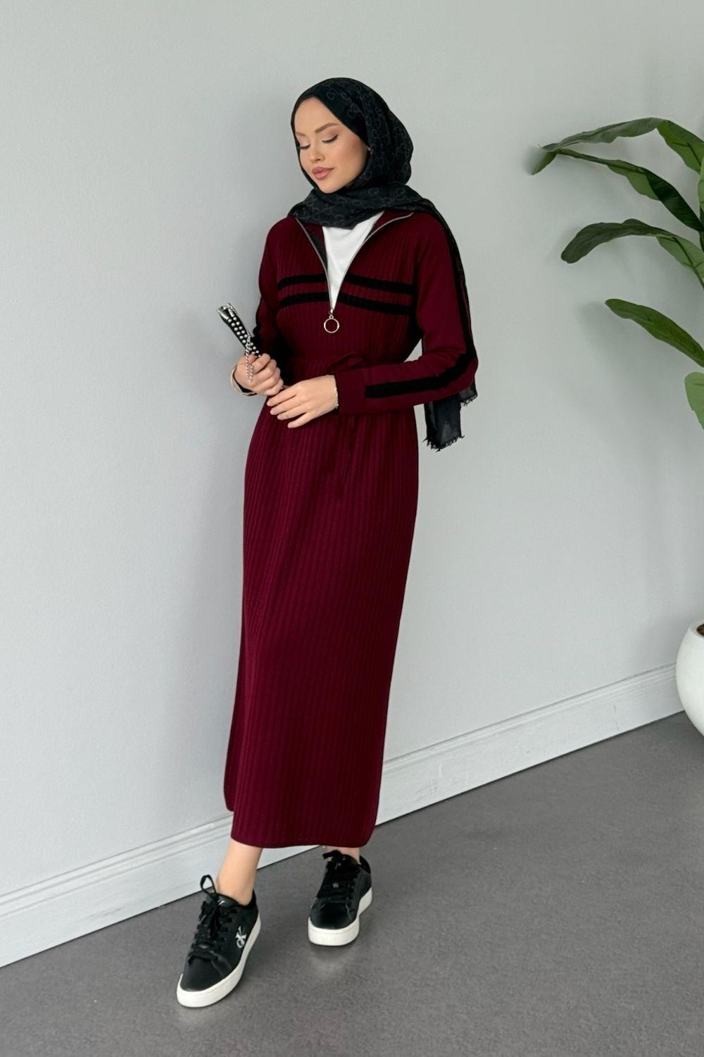 Çizgili Fitilli Fermuarlı Uzun Elbise Bordo (2590)