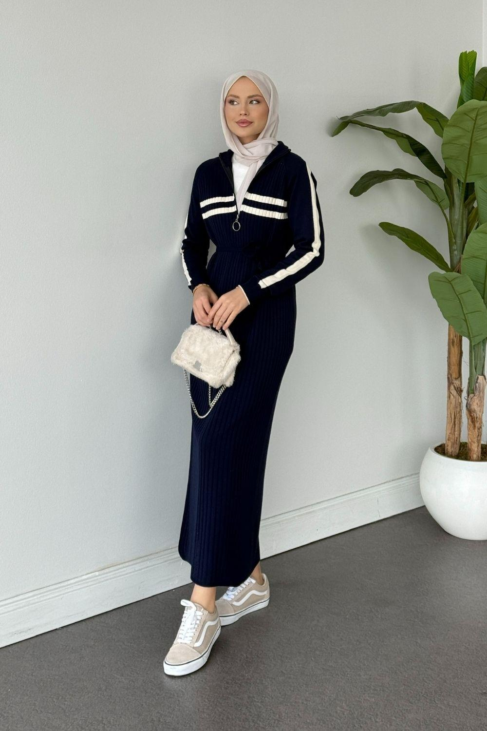 Çizgili Fitilli Fermuarlı Uzun Elbise Lacivert 2590