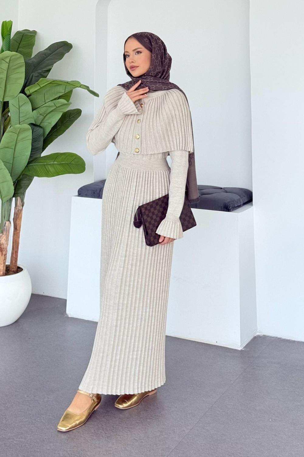 Kelebek Piliseli Etekli Takım , günlük kullanımdan özel günlere kadar geniş bir yelpazede şık bir alternatif sunuyor. İki parçalı yapısı sayesinde crop üstü farklı kombinlerle de kullanma imkanı verirken, triko kumaşın esnek yapısı gün boyu konfor garantisi sağlıyor. Düğme detaylarıyla feminen bir dokunuş kazanan bu set, minimalizm ve şıklığı bir arada sunuyor.