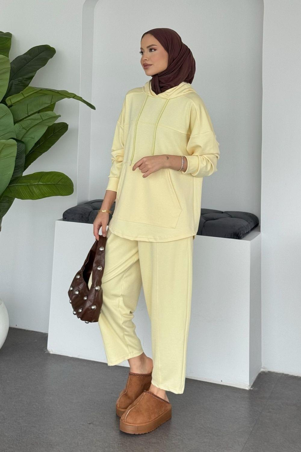 Selanik Modal Takım, günlük yaşamınızda konfor ve stili bir arada sunan pratik bir seçimdir. Evde rahatlık, dışarıda şıklık arayanlar için ideal olan bu takım, modal kumaşının yumuşak dokusu sayesinde tüm gün boyunca maksimum konfor sağlar. Kapşonlu üst ve şalvar kesim alt kombinasyonuyla hem trend hem de fonksiyonel bir tercih olacaktır.