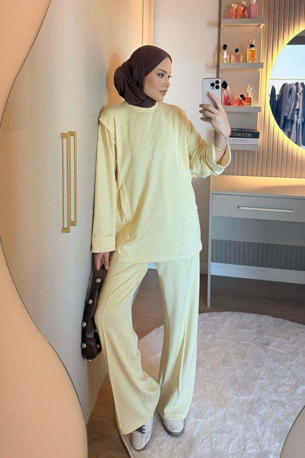 Takım, günlük hayatta rahatlıkla tercih edebileceğiniz şık bir alternatif sunuyor. Özel taş işlemeleri ve bel detayları ile fark yaratan bu takım, hem günlük kullanımda hem de özel günlerde size eşsiz bir stil deneyimi yaşatıyor. Konforlu kumaş yapısı ve vücuda uyum sağlayan kesimi sayesinde gün boyu rahat hissetmenizi sağlıyor.