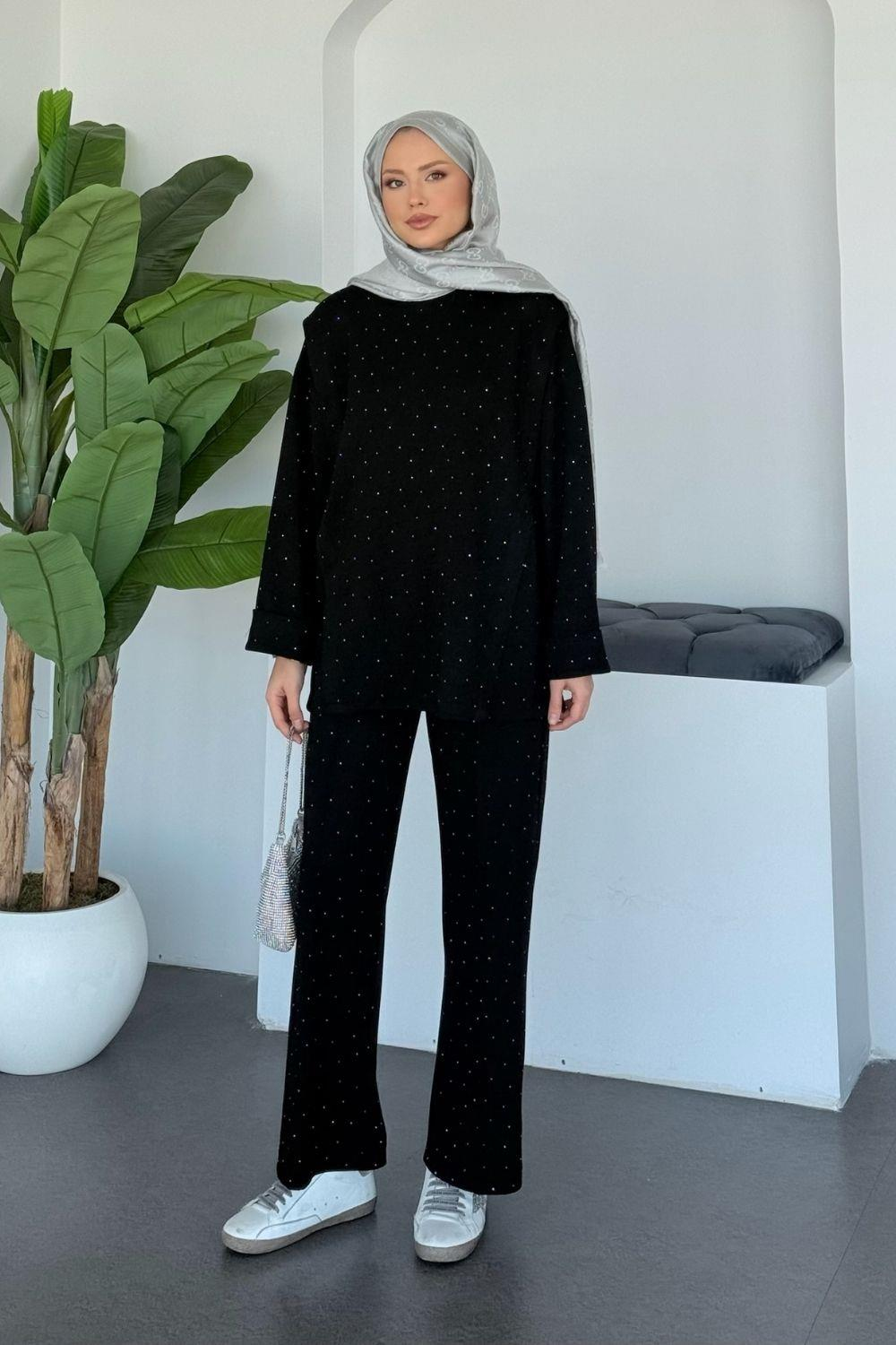 Takım, günlük hayatta rahatlıkla tercih edebileceğiniz şık bir alternatif sunuyor. Özel taş işlemeleri ve bel detayları ile fark yaratan bu takım, hem günlük kullanımda hem de özel günlerde size eşsiz bir stil deneyimi yaşatıyor. Konforlu kumaş yapısı ve vücuda uyum sağlayan kesimi sayesinde gün boyu rahat hissetmenizi sağlıyor.