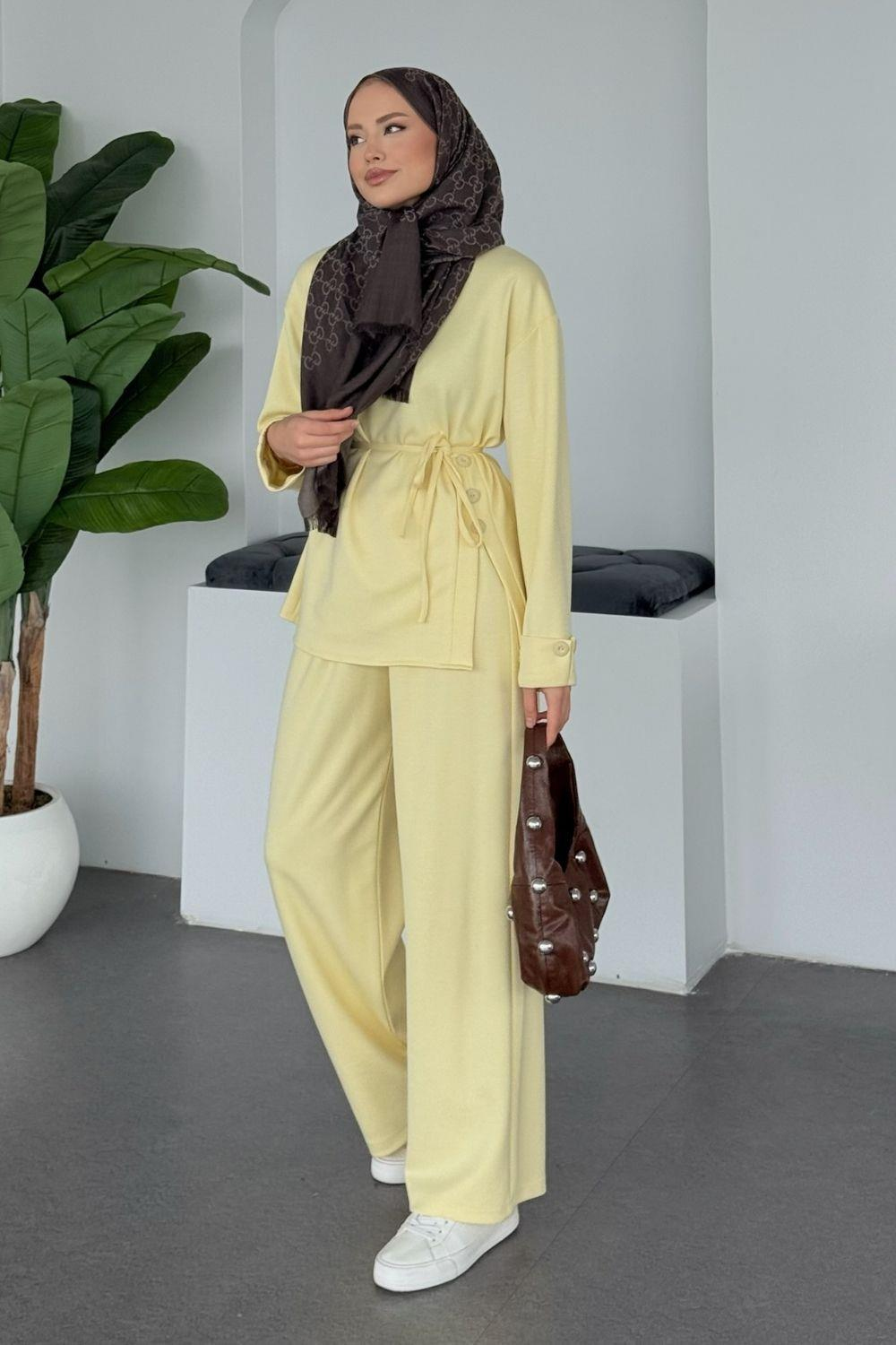 Takım, günlük kullanımda hem konfor hem de şıklık arayanlar için ideal bir seçim. Modal kumaşın yumuşak dokusu ve nefes alabilir yapısı sayesinde tüm gün rahatlık sunarken, düğme detayları ile minimalist bir tarz katıyor. İş günlerinden hafta sonu kaçamaklarına kadar geniş bir kullanım yelpazesine uygun.